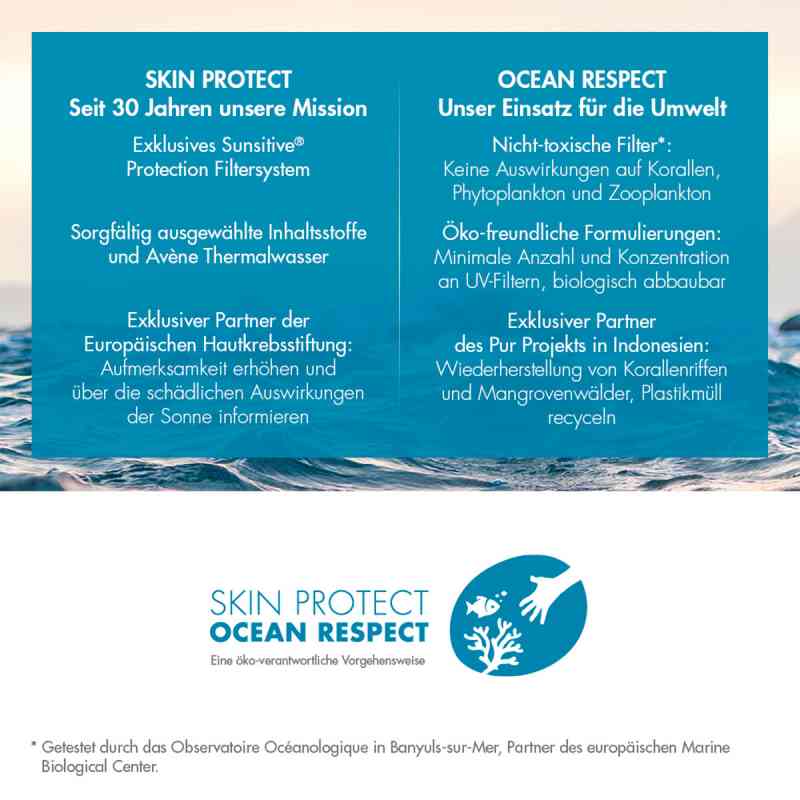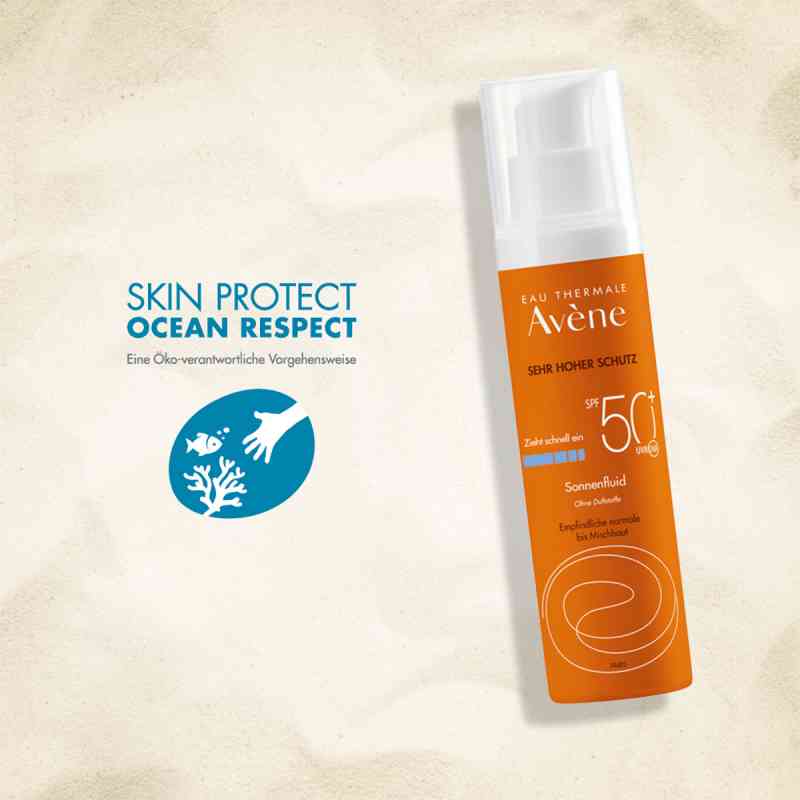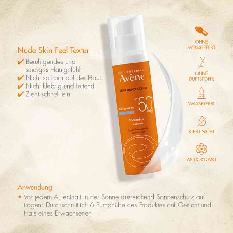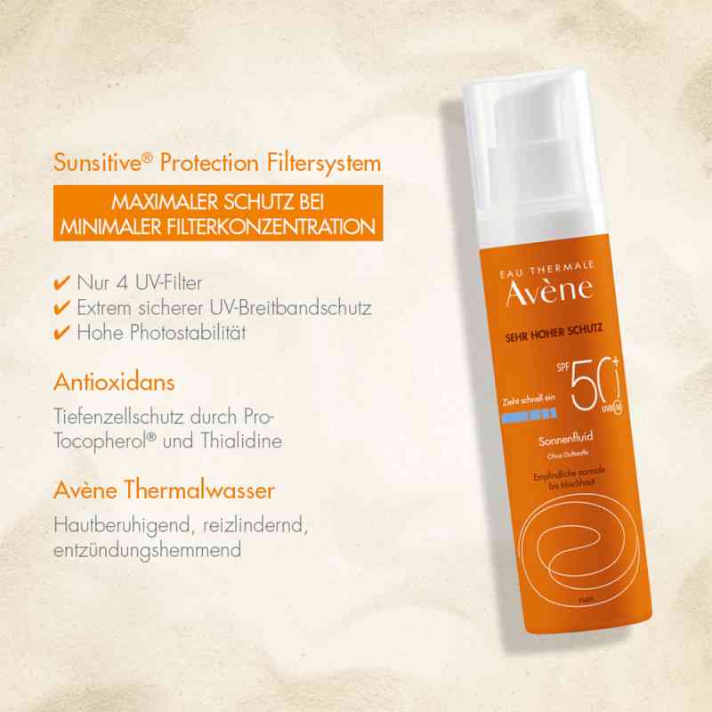 Avene Sunsitive Sonnenfluid Spf 50+ ohne Duftst. (Packungsgröße: 50 ml) ist ohne Duftstoffe, ohne Silikone, ohne Weißeleffekt, O/W-Emulsion.