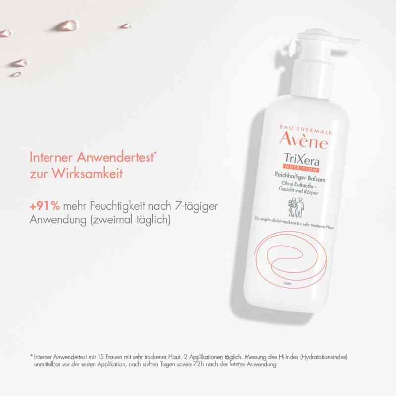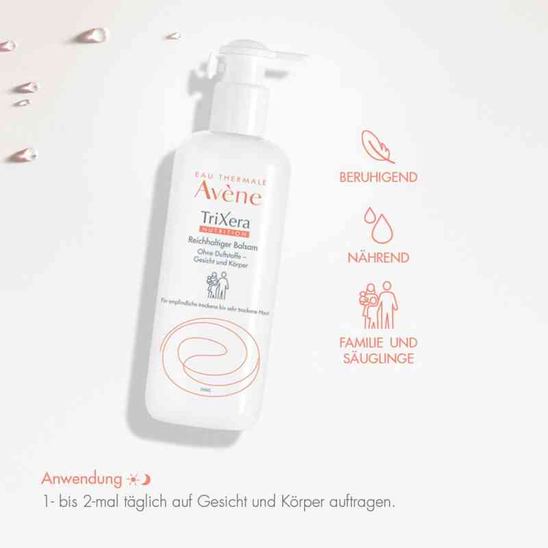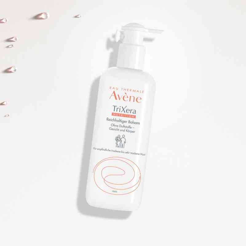 Avene Trixera Nutrition reichhaltiger Balsam (Packungsgröße: 400 ml) 1- bis 2-mal täglich auf die zuvor mit dem Reichhaltigen Reinigungsfluid gereinigte Haut auftragen.