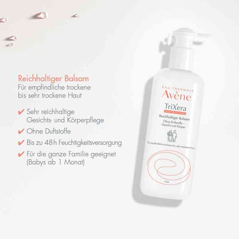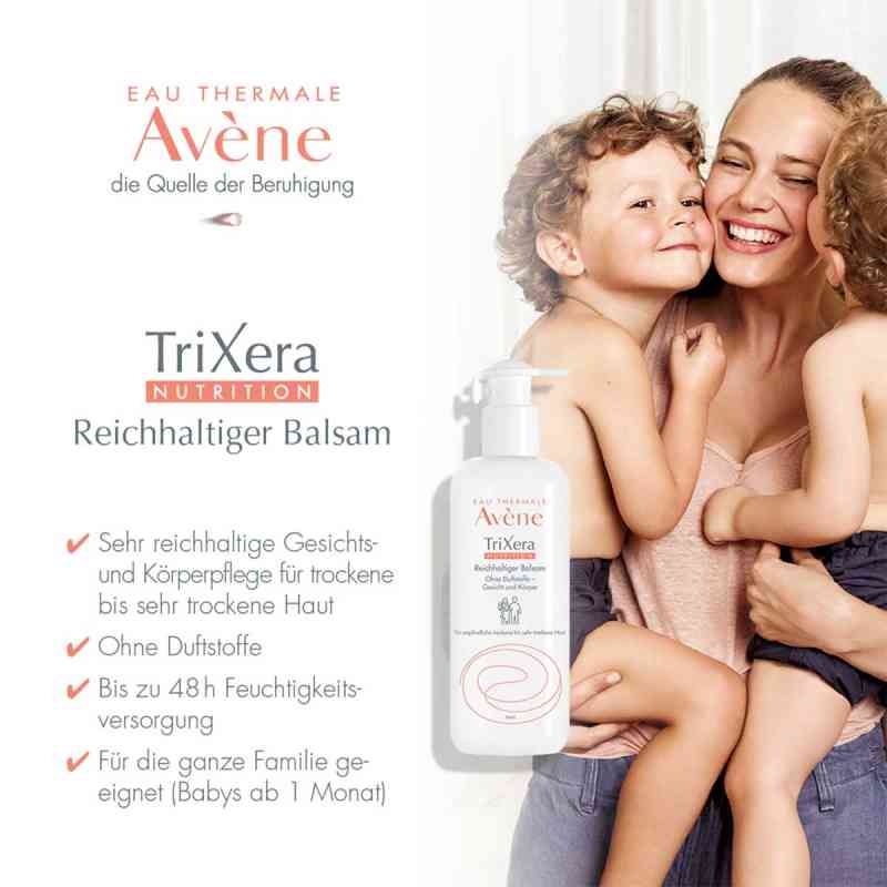 Avene Trixera Nutrition reichhaltiger Balsam (Packungsgröße: 400 ml) regeneriert die Hautbarriere und spendet der sehr trockenen Haut wohltuende Feuchtigkeit. Avene Trixera Nutrition reichhaltiger Balsam (Packungsgröße: 400 ml) ist reichhaltig zur täglichen Körperpflege und für die ganze Familie, es zieht schnell ein und hinterlässt keinen Fettfilm.