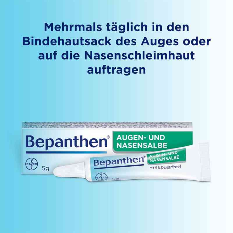 Soweit nicht anders verordnet, wird Bepanthen Augen- und Nasensalbe (Packungsgröße: 5 g) ein bis mehrmals täglich als Salbenstrang (ca. 1 cm) auf die betroffenen Schleimhäute aufgetragen. Die Dauer der Behandlung richtet sich nach Art und Verlauf der Erkrankung. Besonders zu empfehlen ist die Bepanthen Augen- und Nasensalbe (Packungsgröße: 5 g), wenn sie über Nacht einwirken kann.