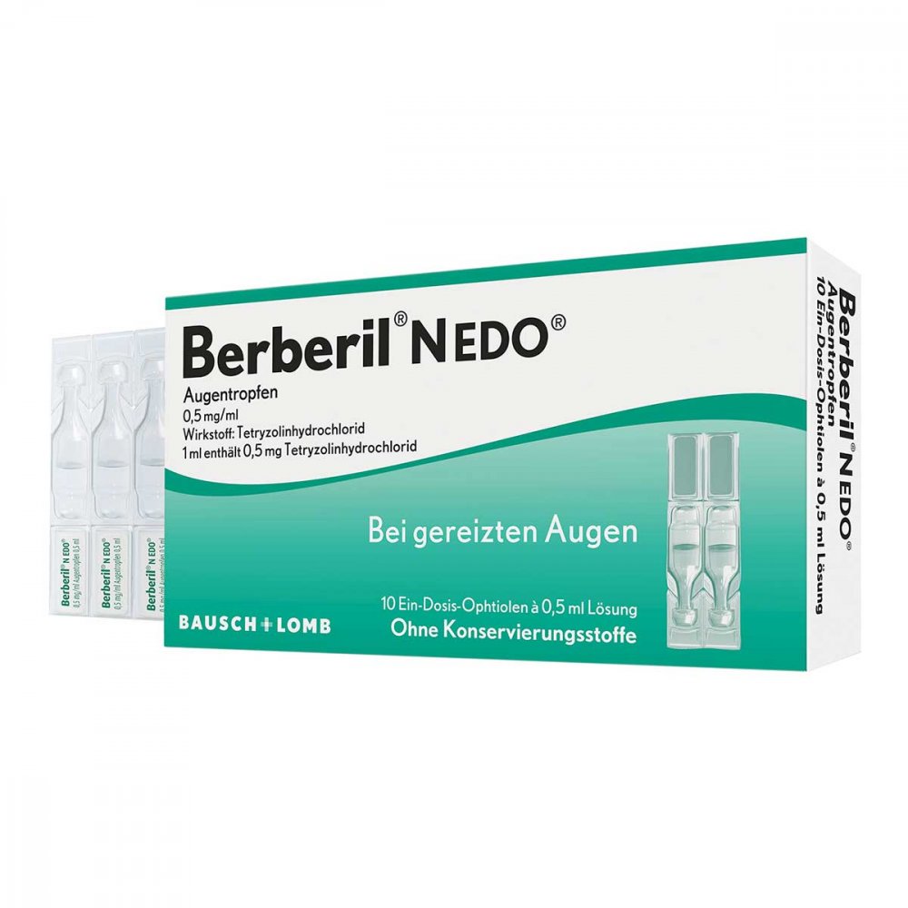 Berberil® N EDO® Augentropfen mit dem bewährten Wirkstoff Tetryzolin beruhigen gereizte Augen minutenschnell. Sie eignen sich zur Behandlung von unspezifischen Augenreizungen und bei allergisch bedingten Entzündungen des Auges wie z.B. durch Heuschnupfen. Die Augentropfen sorgen für eine schnelle Abschwellung erweiterter Gefäße der Augenbindehaut und die Beseitigung von Rötungen. Aufgrund der sehr guten Verträglichkeit sind Berberil® N EDO® Augentropfen auch für Kinder ab 2 Jahren geeignet. Die Anwendung bei Kindern und bei höherer Dosierung darf daher nur unter ärztlicher Kontrolle erfolgen. Produkt auf einen Blick