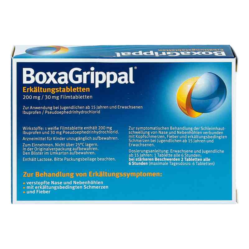Für Erwachsene und Jugendliche ab 15 Jahren bietet Boxagrippal Erkältungstabletten 200 mg/30 mg Fta (Packungsgröße: 20 stk) eine zur Zeit einzigartige und rezeptfreie Hilfe mit der Wirkstoffkombination Ibuprofen bei erkältungsbedingten Schmerzen und Pseudoephedrin zur Abschwellung der Schleimhäute der Nase- und Nasennebenhölen.