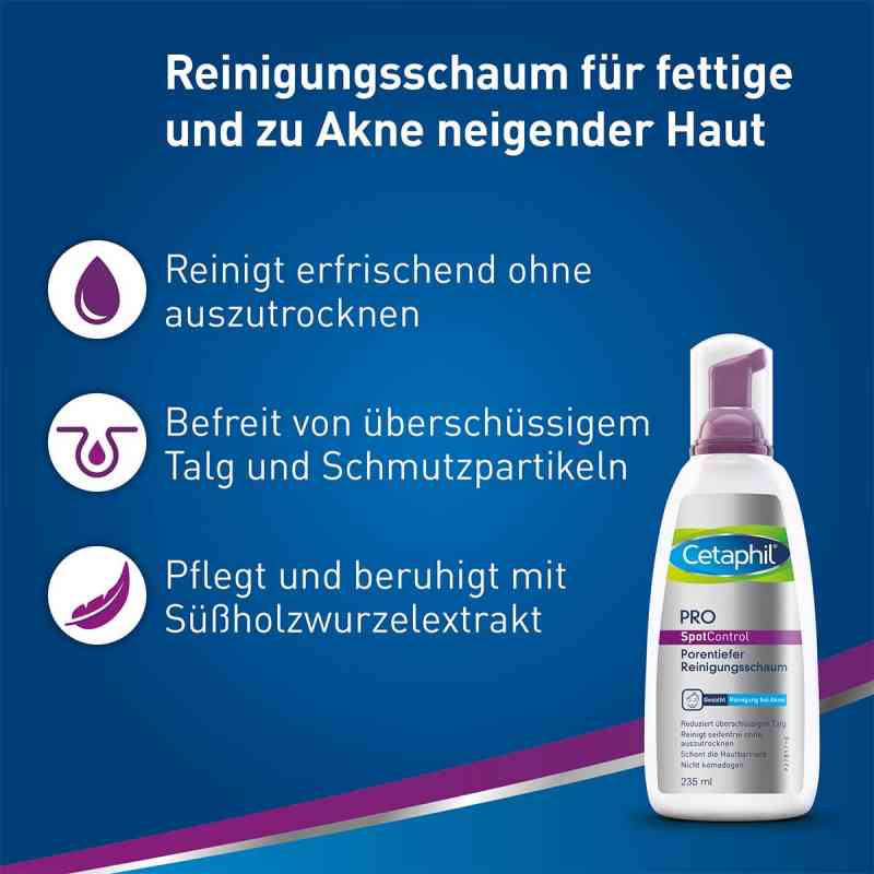 Cetaphil Pro Spot Control porent.Reinigungsschaum (Packungsgröße: 235 ml) ist ein porentiefer Reinigungsschaum zur Anwendung bei zu Akne neigender und unreiner Haut.