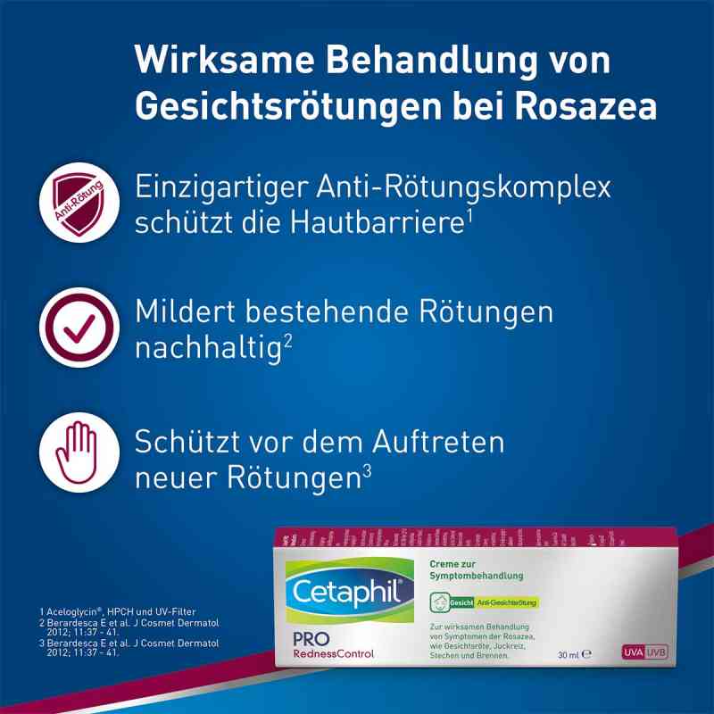 Cetaphil Rednesscontrol Creme z Symptombehandlung (Packungsgröße: 30 ml) ist ein einzigartiger Anti-Rötungskomplex für empfindliche Rosazea-Haut .Cetaphil Rednesscontrol Creme z Symptombehandlung (Packungsgröße: 30 ml) als Medizinprodukt zur wirksamen Behandlung von Symptomen der Rosazea, wie Gesichtsröte, Juckreiz, Stechen und Brennen. Die innovative Gesichtscreme schützt Ihre empfindliche Haut dank einzigartigem Anti-Rötungskomplex vor den externen Auslösern von Gesichtsrötung und reduziert die Rötungen sichtbar und nachhaltig1,2.