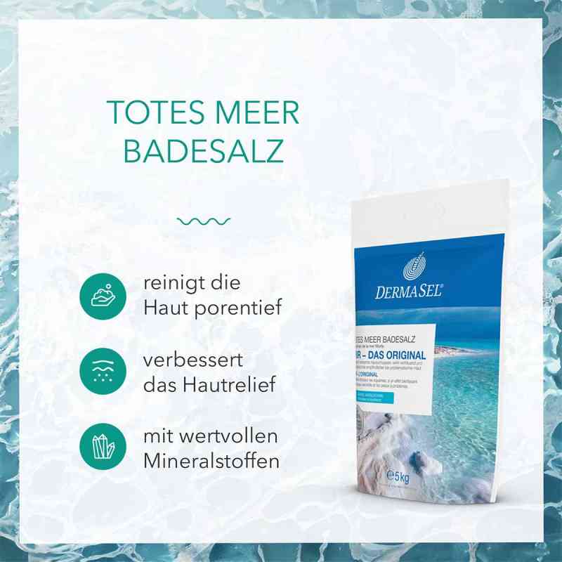 Dermasel Totes Meer Badesalz Pur (Packungsgröße: 5 kg) ist ein Zusatz für Ihr Badewasser. Mit seiner puren Mineralsalz-Kombination aus dem Toten Meer reinigt es die Haut porentief, klärt den Teint und sorgt für ein gutes Hautgefühl.