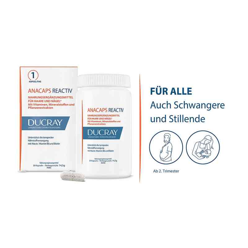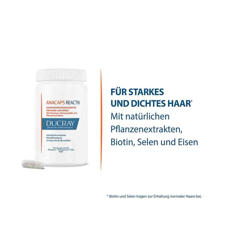 Ducray Anacaps Reactiv Kapseln (Packungsgröße: 30 stk) sind ein Nahrungsergänzungsmittel bei temporären Haarausfall - versorgt das Haar mit wichtigen Nährstoffen, unterstützt das Haarwachstum und kräftigt Haare und Nägel.