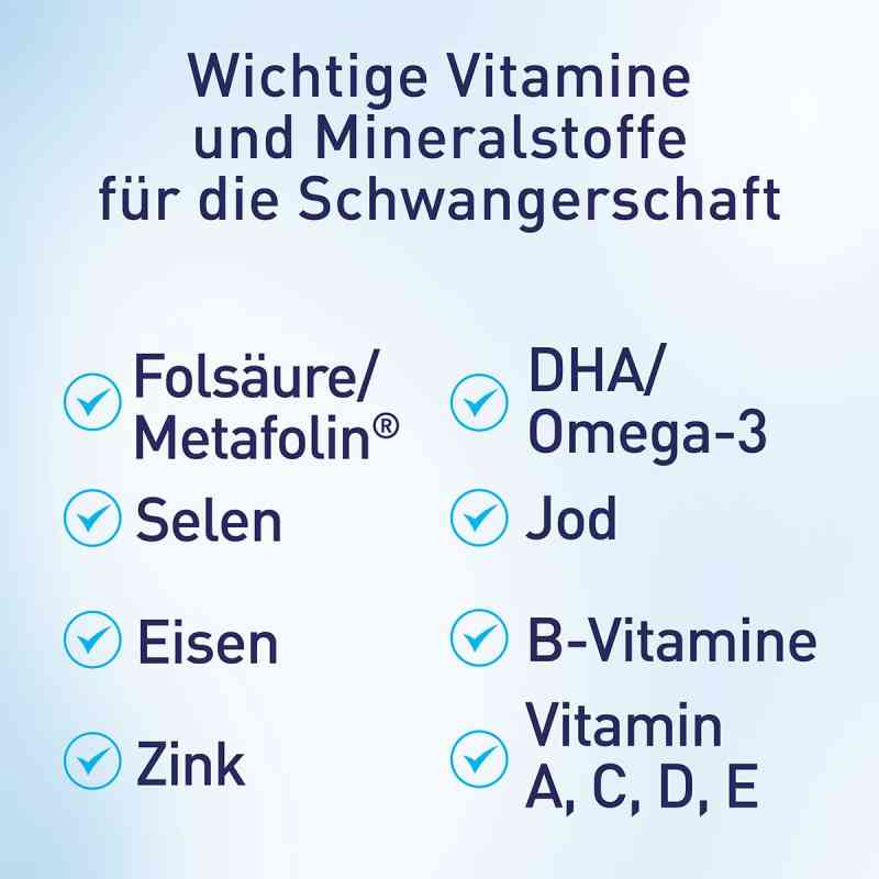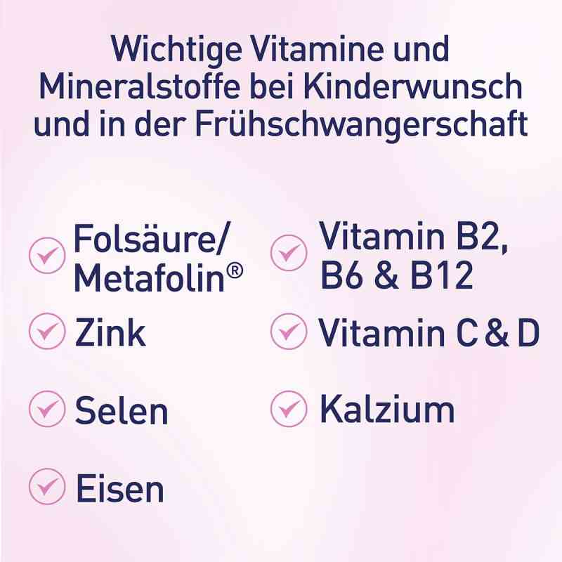 enthält zudem 400 Mikrogramm Folsäure (davon 200 Mikrogramm Metafolin® und 200 Mikrogramm Folsäure), Zink, Selen, Eisen und 15 weitere, speziell kombinierte Vitamine, Spurenelemente und Mineralstoffe.