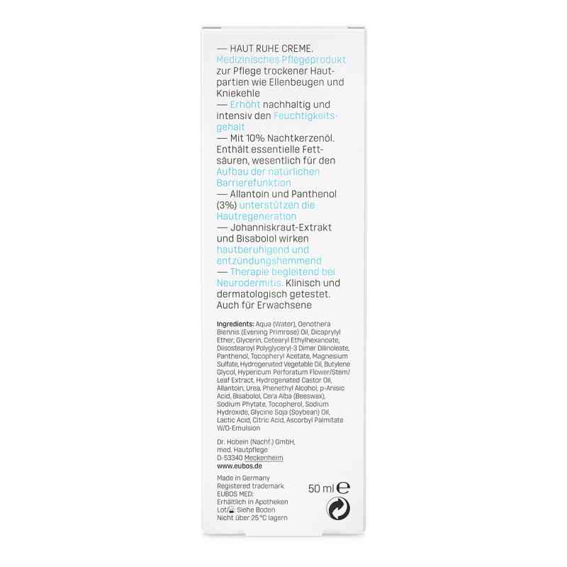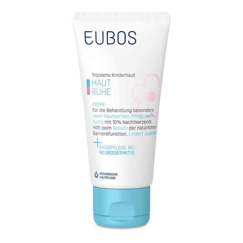 Eubos Kinder Haut Ruhe Creme (Packungsgröße: 50 ml) wird zur Behandlung sehr trockener, rauer Hautpartien eingesetzt, die der besonderen Pflege bedürfen. Die besonders reichhaltige Creme wird bei Neurodermitis auf betroffene Hautstellen, z.B. Ellenbogen und Kniebereich aufgetragen. Die Eubos Kinder Haut Ruhe Creme (Packungsgröße: 50 ml) hinterlässt einen leichten Ölfilm auf der Haut, der vor dem erneuten Austrockenen schützt. So wird der Feuchtigkeitsgehalt nachhaltig erhöht. Eubos Kinder Haut Ruhe Creme (Packungsgröße: 50 ml) kann auch begleitend zu einer Neurodermitis-Therapie angewendet werden.