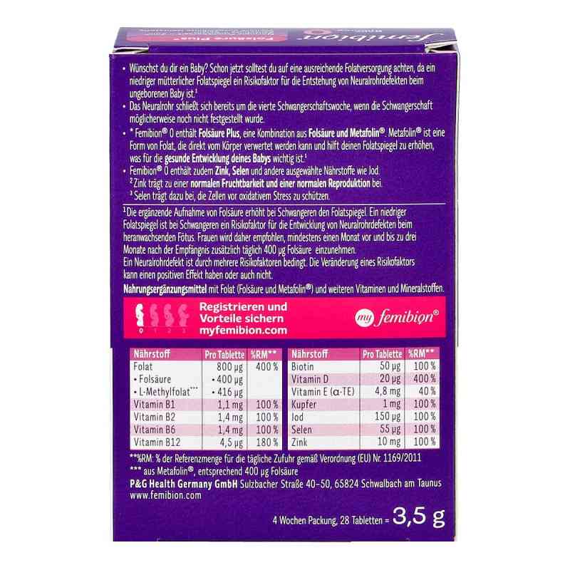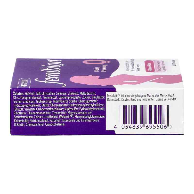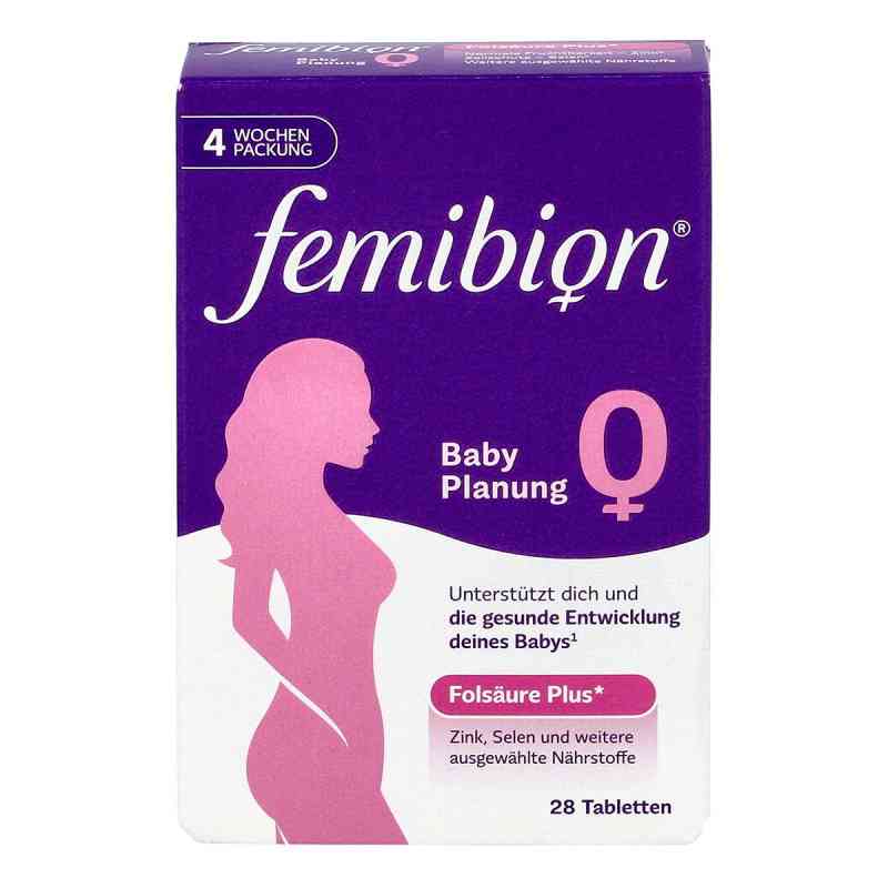 Femibion 0 Babyplanung Tabletten (Packungsgröße: 28 stk) enthalten den wichtigen Stoff Folat, eine besondere Form, die vom Körper der Frau nicht mehr umgewandelt werden muss. Diese Folatform steht dem Körper gleich zur Verfügung. Neben weiteren Vitaminen unterstützt das enthaltene Jod die Schilddrüsenfunktion, welche eine entscheidene Rolle spielt, um schwanger zu werden.