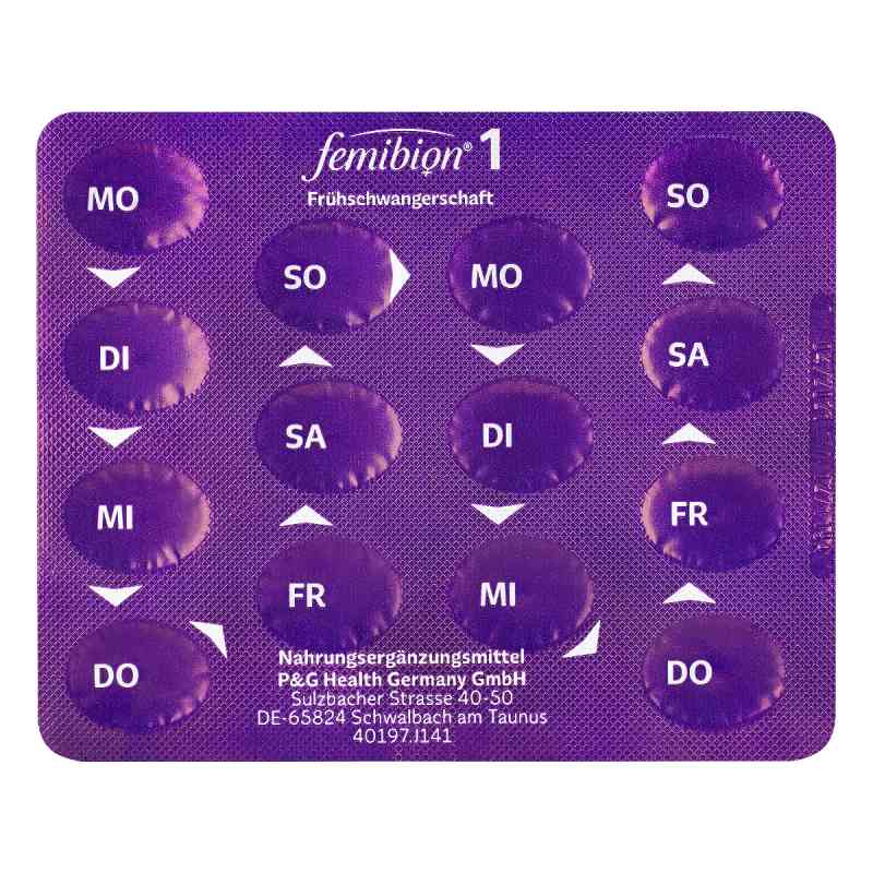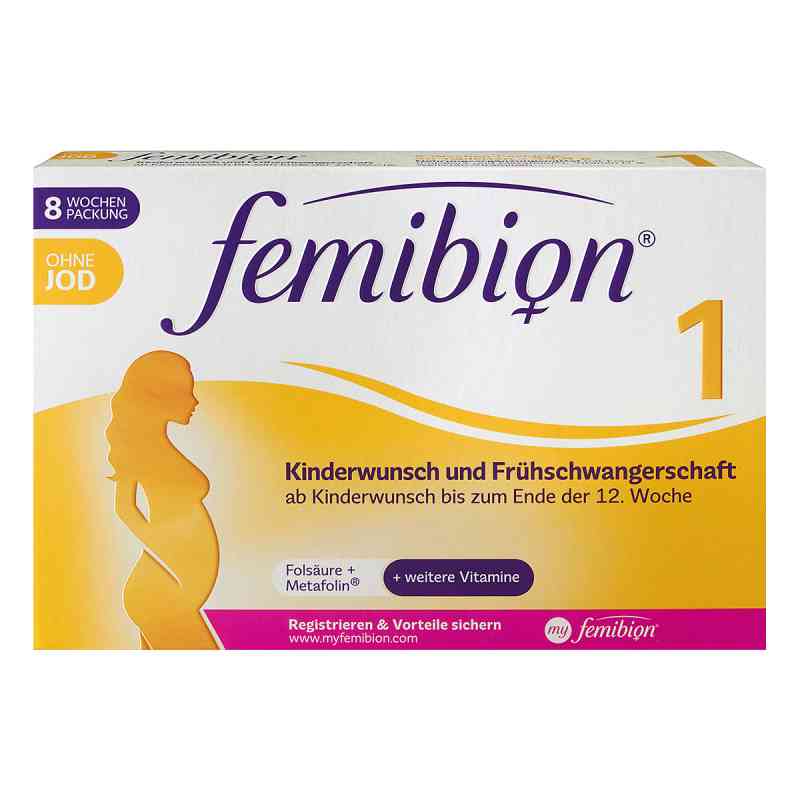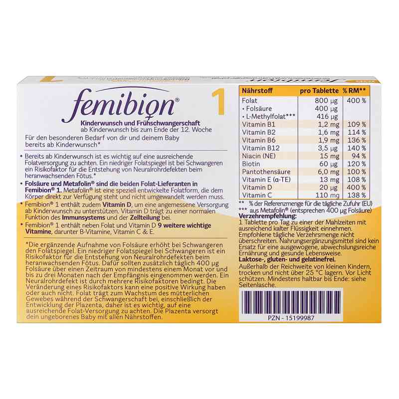 Femibion 1 Kinderwunsch+frühschwangers.o.jod Tabletten (Packungsgröße: 60 stk) ist ein Nahrungsergänzungsmittel welches ab Beginn der Schwangerschaft bis zum Ende des ersten Schwangerschaftsdrittels abgestimmt ist.