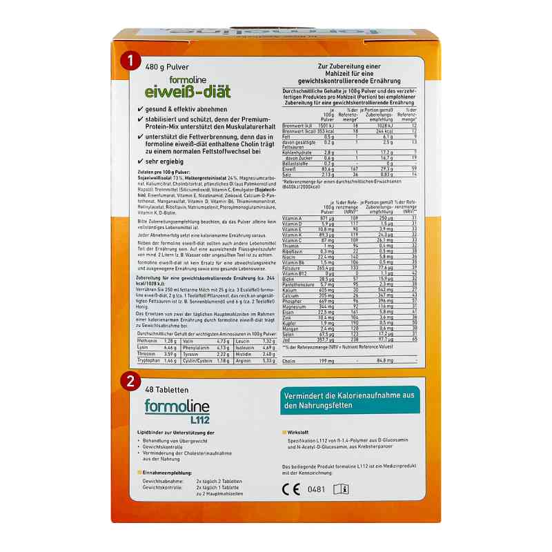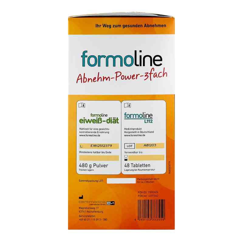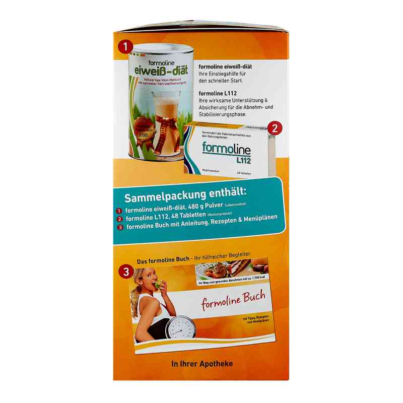 Formoline Abnehm-power-3fach L112+eiweissdiät+buch (Packungsgröße: 1 stk) kombiniert die wirkungsvollen Produkte Formoline L112 Tabletten (48 stk) PZN: 01878414 und Formoline eiweiss-diät Pulver PZN: 05566143 sowie das Formoline Buch PZN: 11592699 zu einer umfassenden Abnehm-Kur.