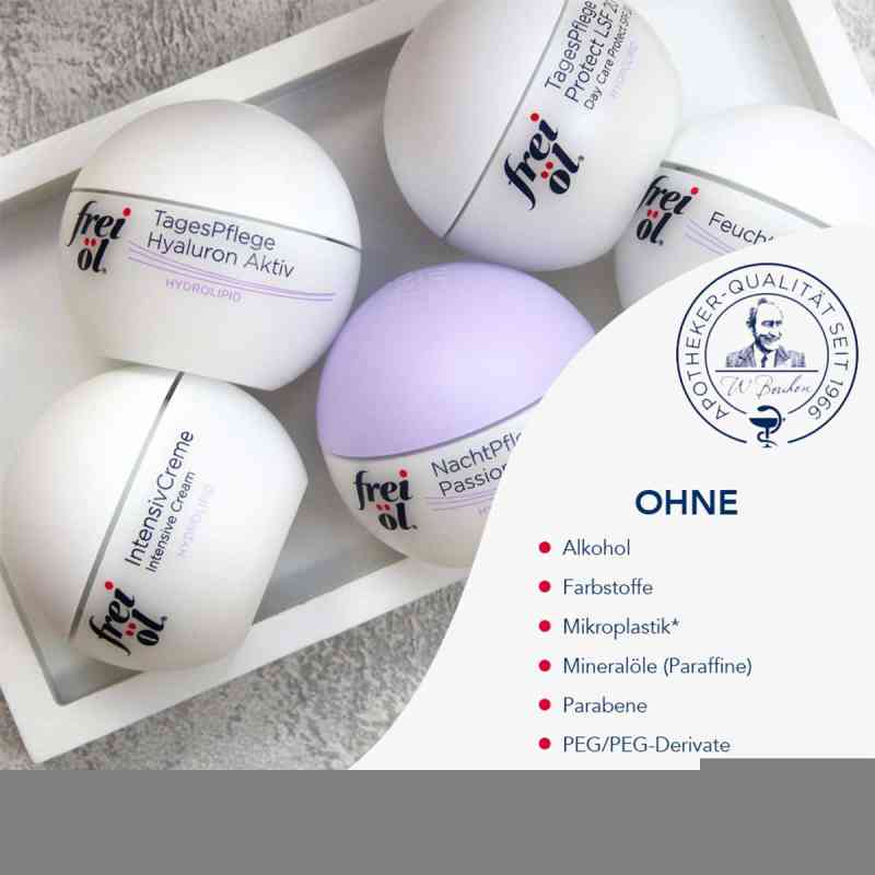 Frei öl Hydrolipid Feuchtigkeitscreme ist ein medizinisches Körperpflegeprodukt. Produkte aus der medizinischen Körperpflege sollen sensible und anspruchsvolle Haut ansprechen. Die Inhaltsstoffe von Produkten aus der medizinischen Körperpflege sind so auf die Eigenschaften der Haut abgestimmt, dass sie diese weniger reizen bzw. allergische Reaktionen bei der Anwendung verhindern. Während bei Produkten der sogenannten dekorativen Kosmetik einzig der Schönheitseffekt im Vordergrund steht, haben medizinische Kosmetik-Produkte wie Frei öl Hydrolipid Feuchtigkeitscreme die Aufgabe, die natürlichen Hautfunktionen zu schützen und zu fördern. Für die speziellen Ansprüche Ihrer Haut sollten Sie Frei öl Hydrolipid Feuchtigkeitscreme gemäß den Verwendungshinweisen gebrauchen.