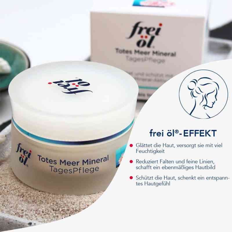 Frei öl Totes Meer Mineral Tagespflege (Packungsgröße: 50 ml) glättet und schützt die Haut und versorgt sie mit viel Feuchtigkeit. Falten und feine Linien werden reduziert, das Hautbild wird insgesamt ebenmäßiger.