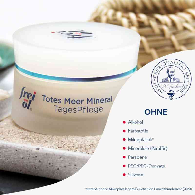 Frei öl Totes Meer Mineral Tagespflege (Packungsgröße: 50 ml) ist ohne Alkohol, allergene Duftstoffe, Farbstoffe, Parabene, Paraffine, PEG/PEG-Derivate und Silikone. Emulsionstyp: O/W,