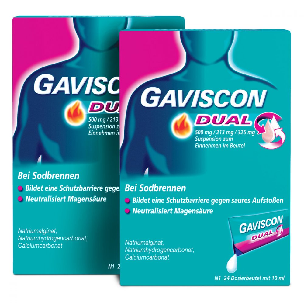 - Set besteht aus: 2x Gaviscon Dual 500mg/213mg/325mg Suspens.im Beutel 24x10ml PZN 04363834