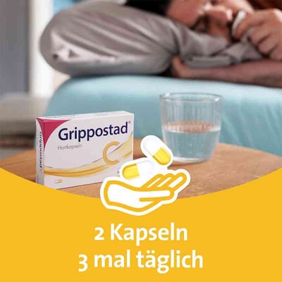 Soweit nicht anders verordnet, nehmen Sie zu Behandlungsbeginn morgens, mittags und abends je 2 Grippostad C (Packungsgröße: 24 stk) ein. Nach Besserung der Beschwerden, nehmen Sie morgens, mittags und abends je 1 Hartkapsel ein. Trinken Sie bei der Einnahme ausreichend Flüssigkeit nach.