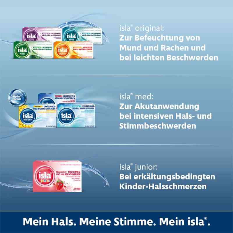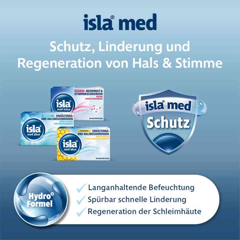 Isla Med voice Pastillen (Packungsgröße: 20 stk) mit dem Hydrogel-Komplex, aus Carbomer und Xanthan-Gummi mit Hyaluronsäure, ist in die Halspastillen eingearbeitet. Durch die Wasserbindungsfähigkeit des Polysaccharids Xanthan-Gummi und das besondere Quellvermögen des Gelbildners Carbomer bildet sich ein Schutzfilm über die gereizten Schleimhäute. Die enthaltene Hyaluronsäure hat die besondere physikalische Eigenschaft, einen Feuchtigkeitsfilm auf der Oberfläche der Schleimhäute zu entwickeln.