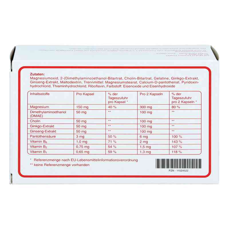 DMAE, Cholin, Ginkgo-Extrakt, Ginseng-Extrakt, Pantothensäure, Vitamin B1, Vitamin B2, Vitamin B6, Magnesium