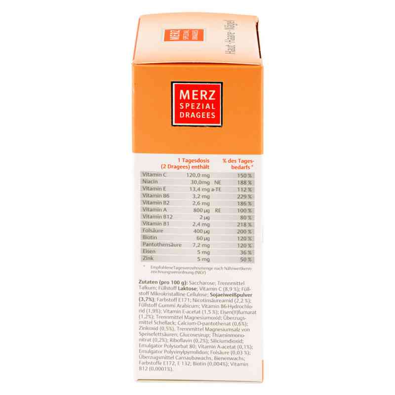 Merz Spezial Dragees (Packungsgröße: 120 stk) ist Ihr Produkt für natürliche Schönheit von innen. Merz Spezial Dragees (Packungsgröße: 120 stk) enthalten eine spezielle Wirkstoffkombination aus 14 verschiedenen, aufeinander abgestimmten Vital- und Aufbaustoffen, die zur Versorgung von Haut, Haaren und Nägeln dienen. Diese Kombination hilft Ihnen, Ihre Haut glatt und geschmeidig zu erhalten, Ihrem Haar die Elastizität und Spannkraft zurückzugeben und das Wachstum und die Struktur Ihrer Nägel zu verbessern.