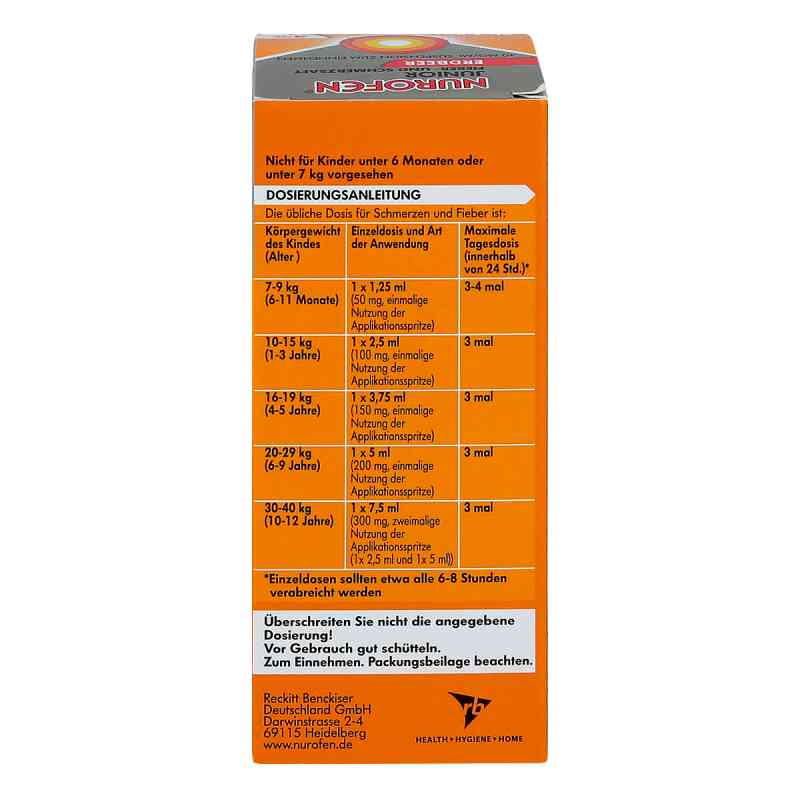 Nutzen Sie Nurofen Junior Fieber- und Schmerzsaft Erdbeer 40mg/ml (Packungsgröße: 100 ml) zur Behandlung von leichten bis mäßigen Schmerzen sowie von Fieber für Kinder ab 6 Monate. Durch die neue Rezeptur von Nurofen Junior Fieber- und Schmerzsaft Erdbeer 40mg/ml (Packungsgröße: 100 ml) muss Ihr Kind nun für die gleiche Wirkung nur noch die halbe Saftmenge schlucken. Die beigefügte Dosierspritze erleichtert Ihnen die genaue Dosierung nach Alter und Gewicht des Kindes.