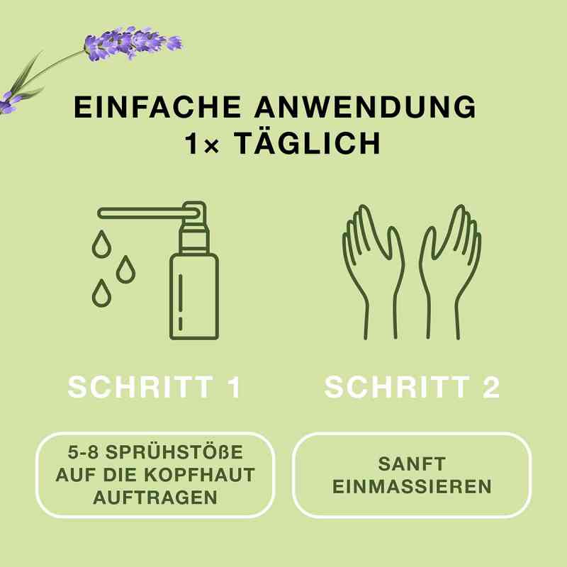 - 2. 5 – 8 Sprühstöße auf die gesamte Kopfhaut auftragen.