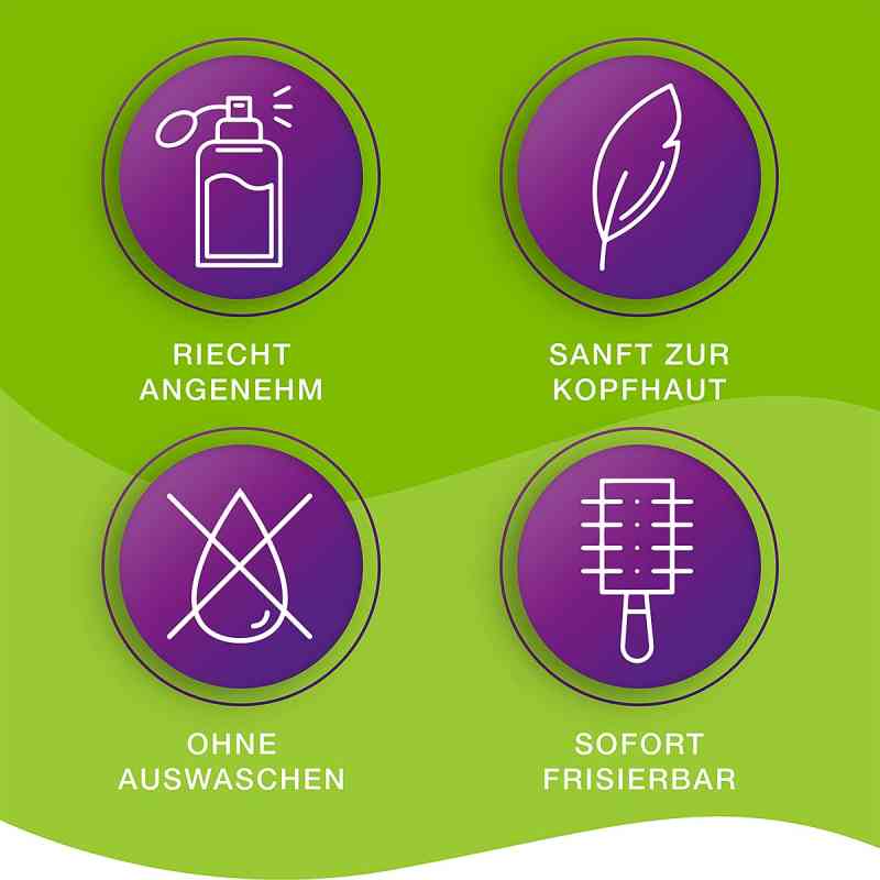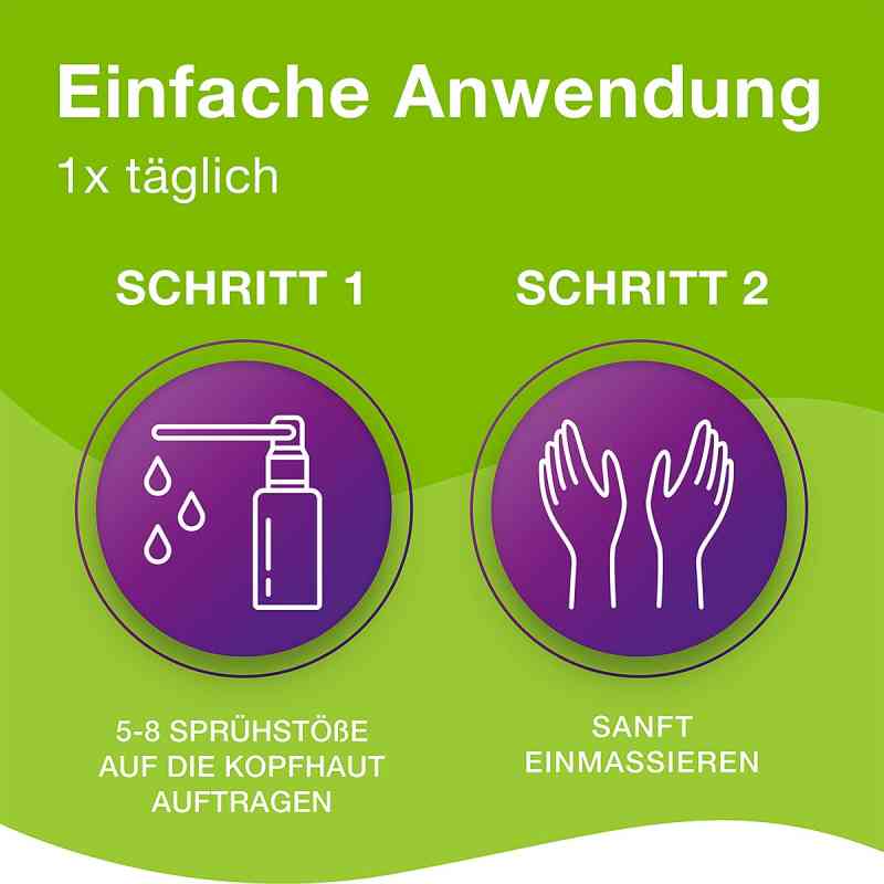 - 2. 5 – 8 Sprühstöße auf die gesamte Kopfhaut auftragen.