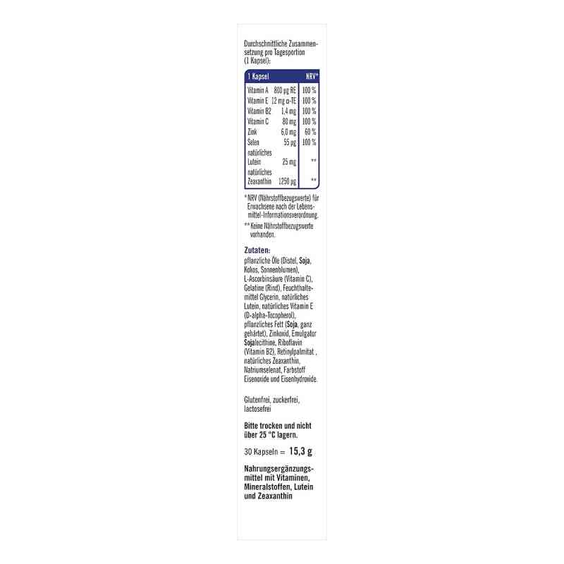 Retinol palmitat, entspricht Retinol, Riboflavin, Ascorbinsäure, (R,R,R)-[alpha]-Tocopherol-Äquivalent, Natriumselenit, entspricht Selen(IV)-Ion, Zinkoxid, Lutein, Zeaxanthin, Safloröl, Sojaöl, entspricht Erdnussöl, Gelatine, Glycerol, Sojaöl, partiell hydriert, Lecithin (Sojabohne), Eisenoxide und -hydroxide.
