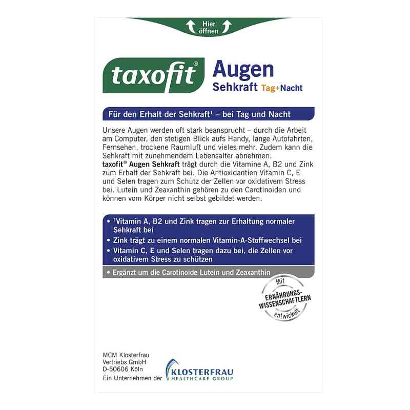 Taxofit Augen Sehkraft Kapseln (Packungsgröße: 30 stk) mit Vitamin A, B2 und Zink trägt zum Erhalt der Sehkraft bei.