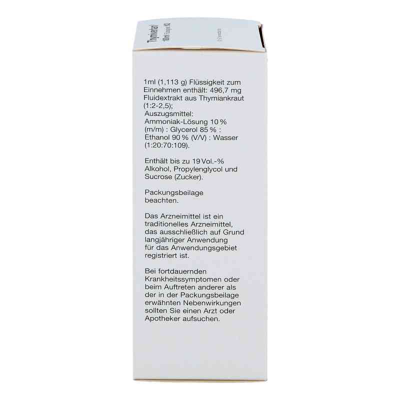 496.7 mg Thymiankraut Fluidextrakt, (1:2-2,5), Auszugsmittel: Ammoniak 10% (m/m), Glycerol 85% (m/m), Ethanol 90% (V/V), Wasser (1:20:70:109)